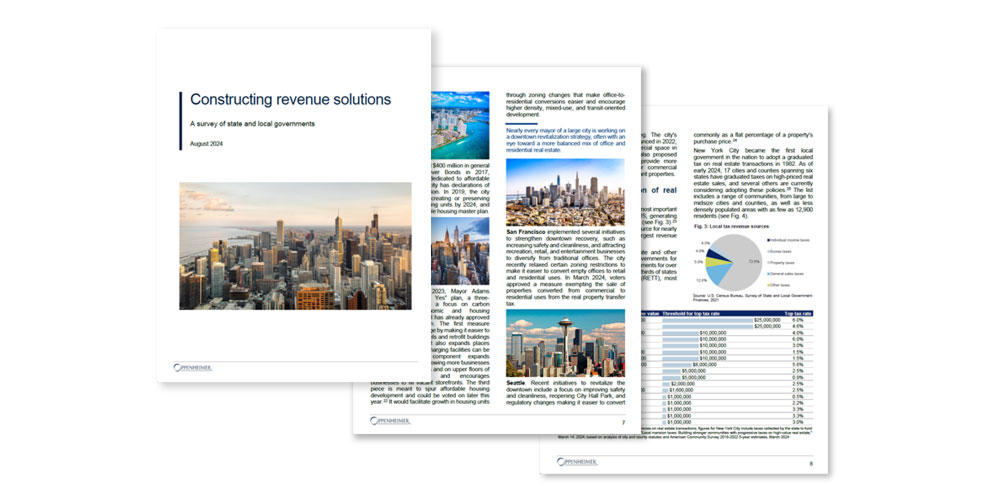 Authored by Kristin Stephens, Managing Director in Oppenheimer’s Public Finance group, this newly published white paper explores innovative revenue initiatives underway across state and local governments. As leaders continually seek ways to improve fiscal efficiency, this report offers a comprehensive survey of the landscape that may provide valuable insights.