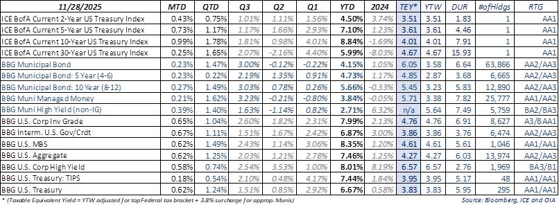 For municipals, year-end technicals continue to support the asset class. Issuance is light, reinvestment flows are steady, and the Treasury range has been stable. Intermediate AAA yields continue to look attractive on a taxable-equivalent basis, and we view any meaningful backup in yields as an opportunity to add high-quality exposure into December.