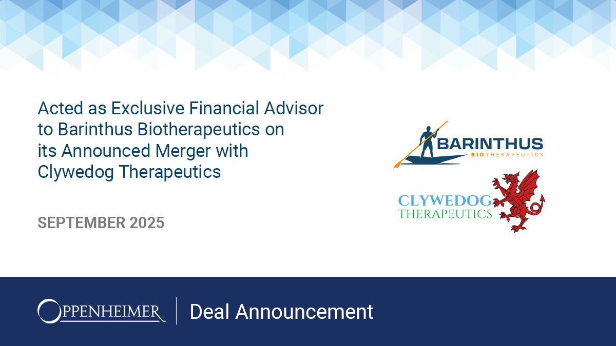 Oppenheimer & Co. Inc. Acted as Exclusive Financial Advisor to Barinthus Biotherapeutics on its Announced Merger with Clywedog Therapeutics