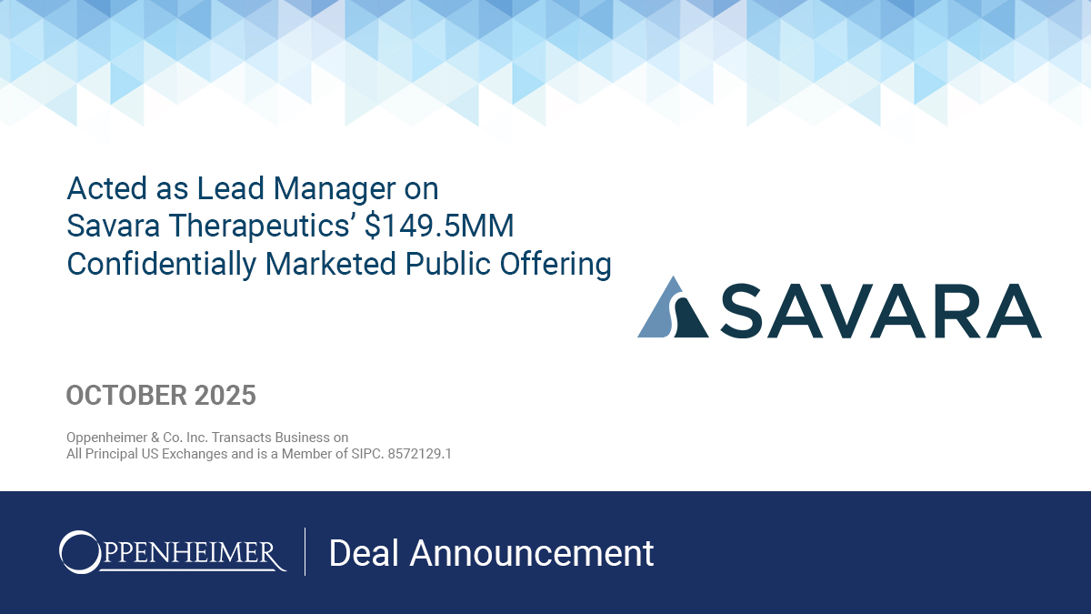 Oppenheimer & Co. Inc. acted as Lead Manager on Savara Therapeutics’ $149.5MM Confidentially Marketed Public Offering