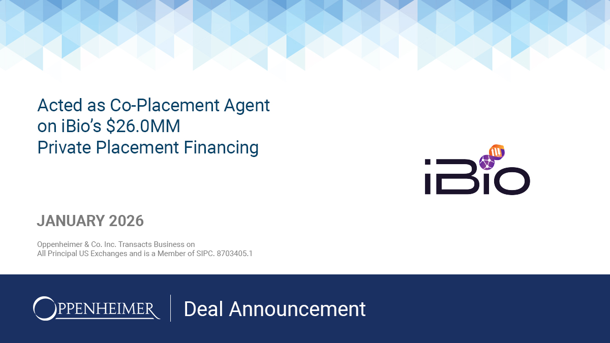 Oppenheimer & Co. Inc. acted as Co-Placement Agent on iBio’s $26.0MM Private Placement Financing
