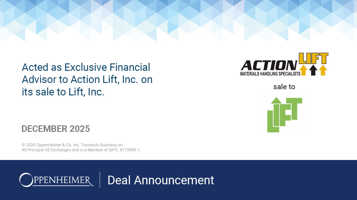 Oppenheimer & Co. Inc. acted as Exclusive Financial Advisor on Action Lift, Inc.’s sale to Lift, Inc. on December 8, 2025. Action Lift, Inc. ("Action Lift", or the "Company") is a regional provider of material handling equipment, maintenance services and warehouse solutions. The Company maintains longstanding relationships with leading forklift OEMs. Action Lift's distribution capabilities are complemented by rental, parts and service offerings supported by a dedicated team of service technicians to deliver a “one-stop-shop” offering to its customers. Action Lift was founded in 1985 and is headquartered in Pittston, PA.