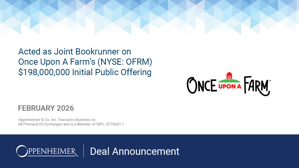 On February 5th, 2025 Oppenheimer & Co. acted as a Joint Bookrunner for Once Upon A Farm's ("OFRM" or the "Company") $198,000,000 initial public offering. The Company sold 11.0 million shares at an initial offering price of $18.00.