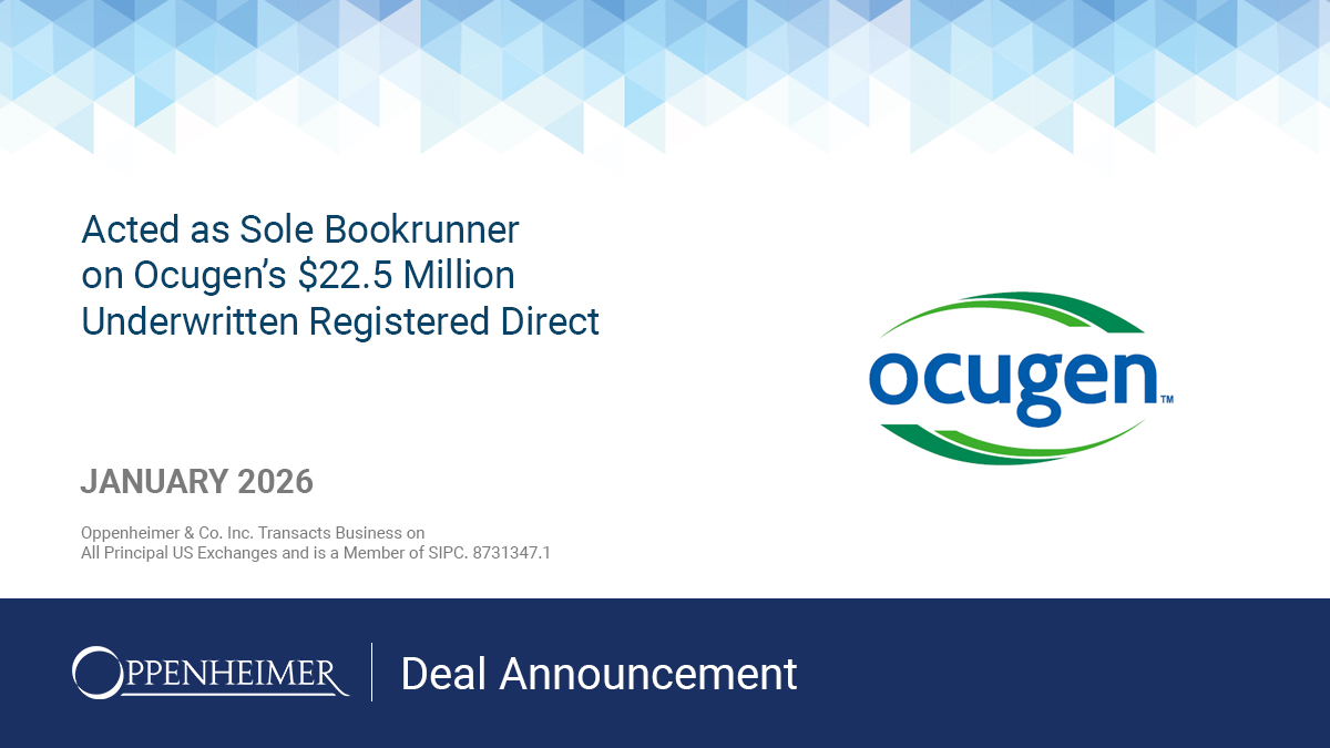 Oppenheimer & Co. Inc. acted as Sole Bookrunner on Ocugen’s $22.5 Million Underwritten Registered Direct