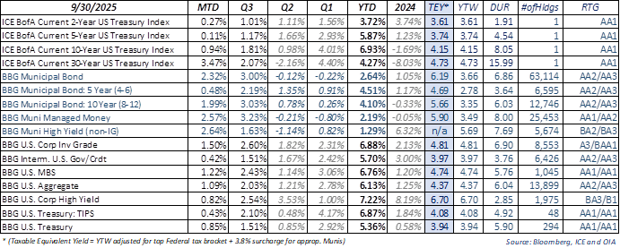 In Tax-exempt fixed income: Municipals finally joined the broader fixed income rally, with long maturities benefiting from weaker employment data and muted tariff pass-through. Performance is now more in line with taxable markets, while concerns about elevated supply earlier this year are fading as we move closer to year-end.