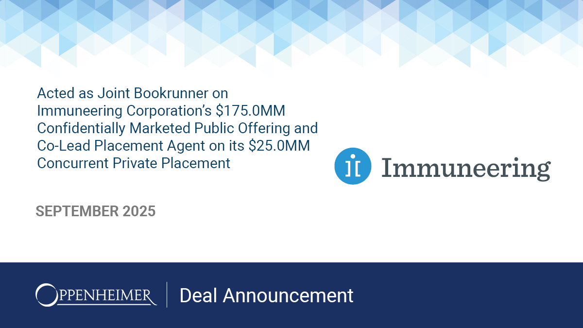 Oppenheimer & Co. Inc. acted as Joint Bookrunner on Immuneering Corporation’s $175.0MM Confidentially Marketed Public Offering and Co-Lead Placement Agent on its $25.0MM Concurrent Private Placement