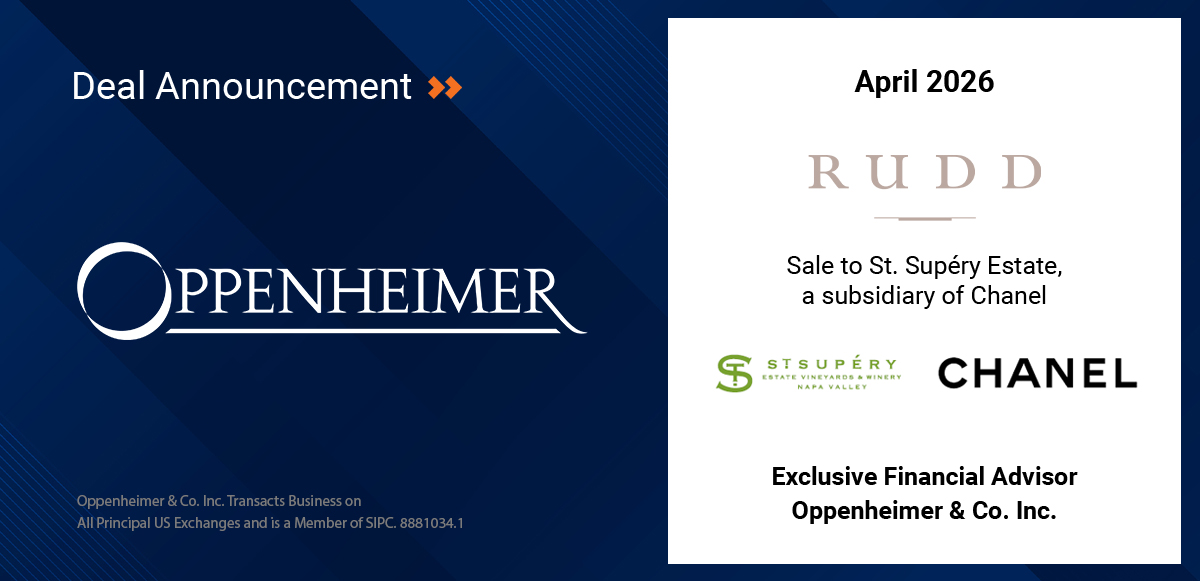 Oppenheimer & Co. has acted as Exclusive Financial Advisor to the Rudd Family Trusts on the sale of Rudd Estate (“Rudd” or the “Company”) to St. Supéry Estate Vineyards & Winery (“St. Supéry”), a subsidiary of Chanel, Inc. (“Chanel”).