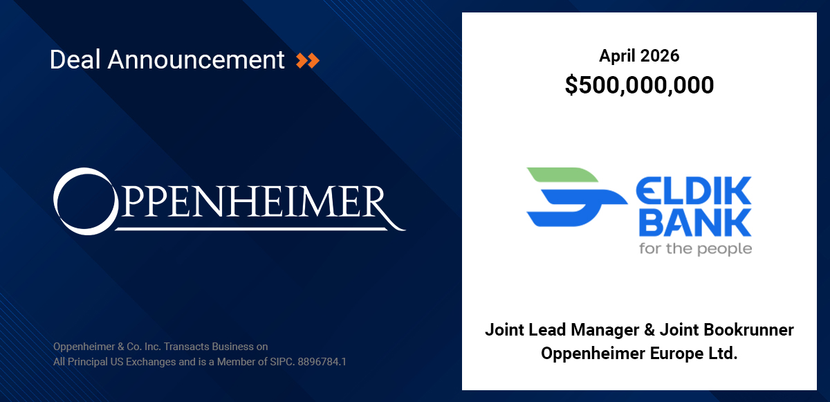 Oppenheimer’s European Capital Markets Group is pleased to announce it has acted as Joint Lead Manager & Joint Bookrunner on Eldik Bank’s debut $500 million U.S. dollar-denominated sovereign bond issuance