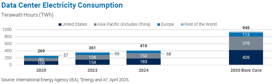 The compute necessary to build and train complex AI models requires a broad array of large-scale data centers, and these AI-focused companies are rapidly expanding their data center footprint in response. The sheer power demand of these facilities, with some individual centers requiring city-scale electricity, is driving a structural shift in the energy sector. This surging demand, projected to more than double globally by 2030, is straining electric grids. To meet this unprecedented need, utility companies are exploring options that include new natural gas plants, additional renewable and nuclear capacity, and in some cases, delaying the retirement of older, less-clean facilities. However, bringing new power onto the grid will take time and near-term power constraints will persist.