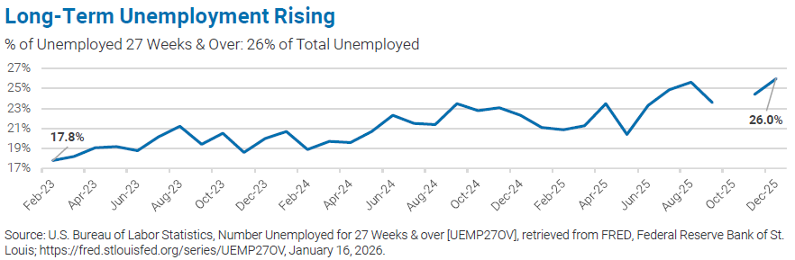 The outlook for further rate reductions is cloudy. The Fed’s Summary of Economic Projections released in December showed wide dispersion amongst year-end rate projections for 2026, with the median estimate calling for just one rate cut in the year. Ultimately, a further softening of the labor market may force the Fed’s hand to cut interest rates more aggressively.